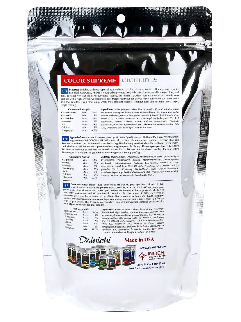 Dainichi Color Supreme 250g Small (3mm) Sinking Pellets is a colour‑enhancing cichlid diet enriched with spirulina, krill and calcium montmorillonite clay to intensify pigmentation, support clean digestion and promote steady growth in small to medium cichlids. The 3 mm sinking pellet encourages natural mid‑to‑bottom feeding, delivering high digestibility, low waste and robust condition in community and species tanks.